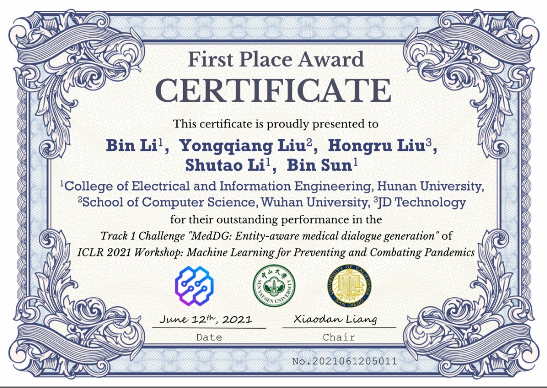 2021/07/06李樹濤教授課題組在國際表征學習會議2021 MLPCP挑戰(zhàn)賽醫(yī)療對話生成賽道獲第一名獲獎證書。國際表征學習會議(ICLR,International Conference on Learning Representations)是機器學習領域最負盛名的三大頂級國際會議之一。為了推動機器學習技術在醫(yī)療健康領域的發(fā)展,ICLR 2021發(fā)起了機器學... -