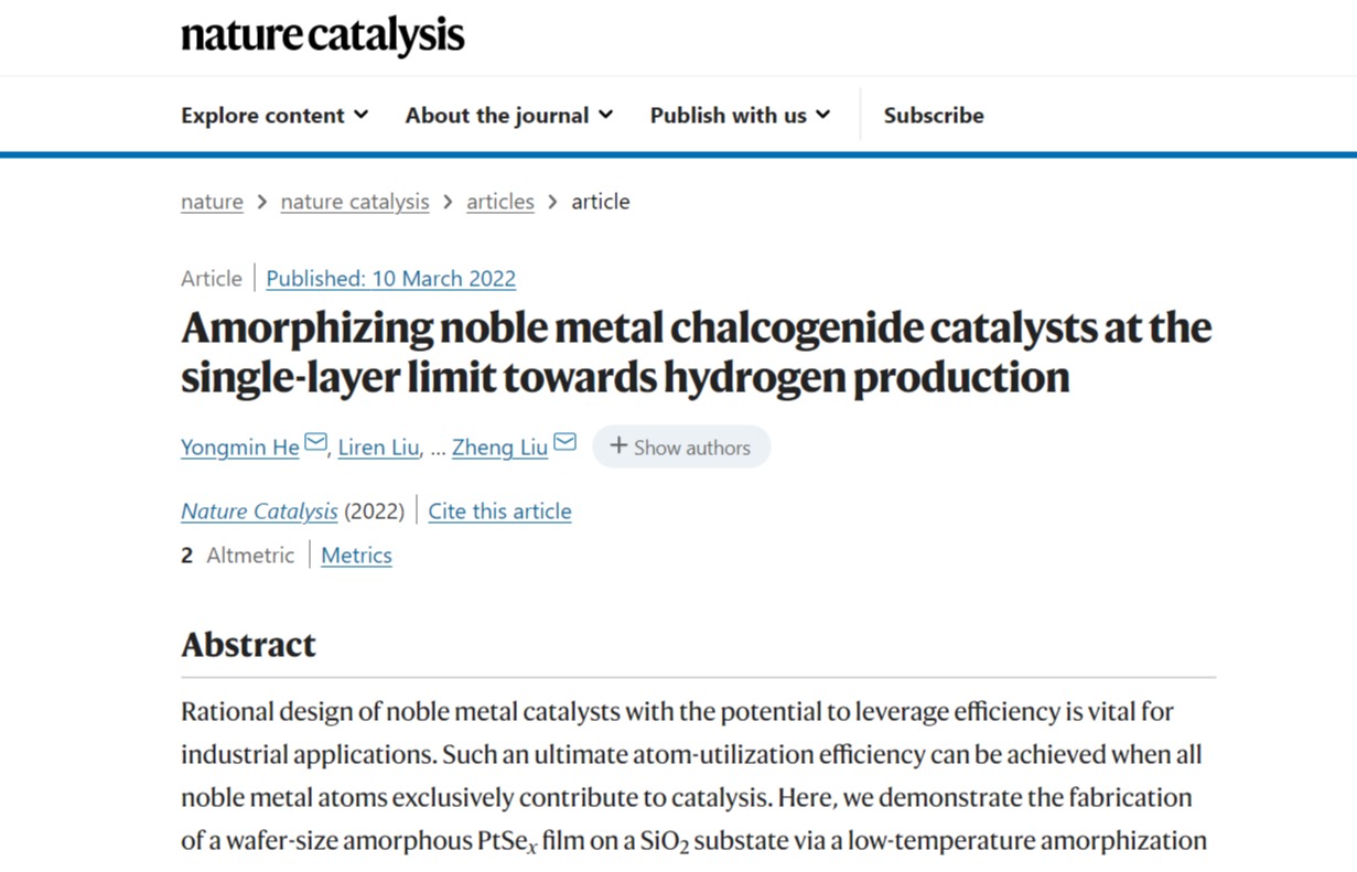 2022/03/11何勇民課題組在“單原子層”貴金屬催化劑研究上取得重要進展近日,我校化學化工學院何勇民教授和新加坡南洋理工大學劉政教授、南京航空航天大學張助華教授團隊合作,設計了單原子層貴金屬催化劑,該研究成果以“Amorphizing noble metal chalcogenide catalysts at the sin...