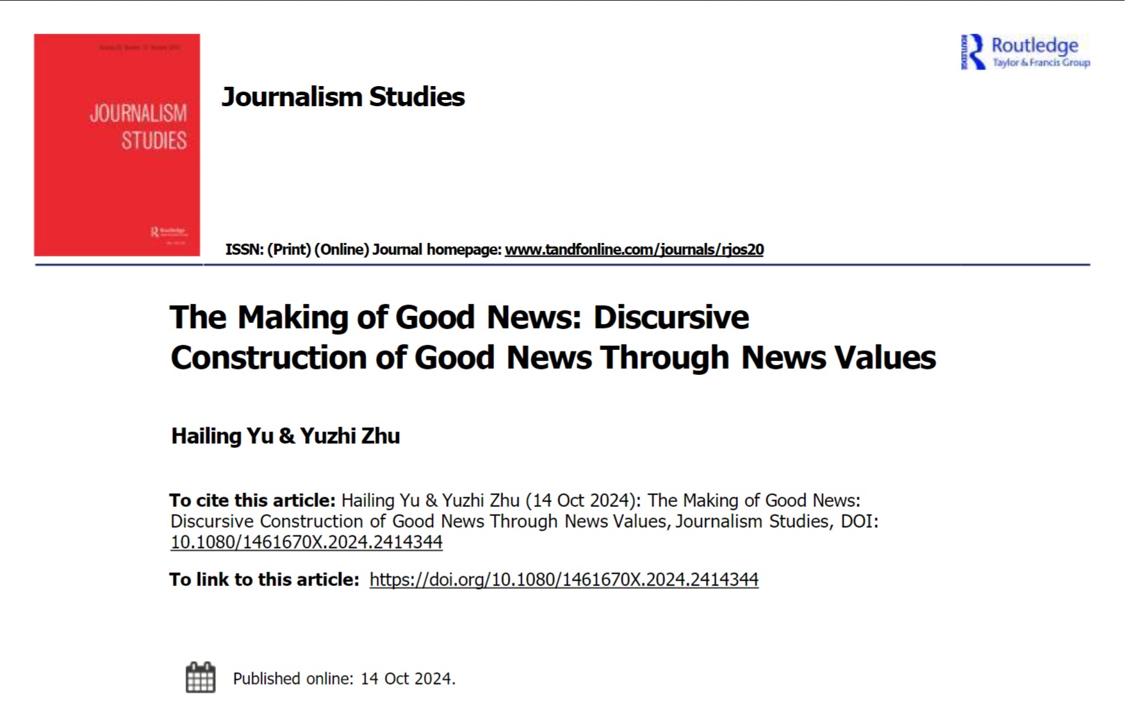 2024/10/24外國語學(xué)院于海玲教授跨學(xué)科研究成果在新聞傳播學(xué)頂級(jí)期刊發(fā)表近日,外國語學(xué)院于海玲教授團(tuán)隊(duì)在語言學(xué)、新聞傳播學(xué)跨學(xué)科研究中取得了新進(jìn)展。研究成果以“The Making of Good News: Discursive Construction of Good News Through News Values”為題,在新聞傳播學(xué)領(lǐng)域頂級(jí)...